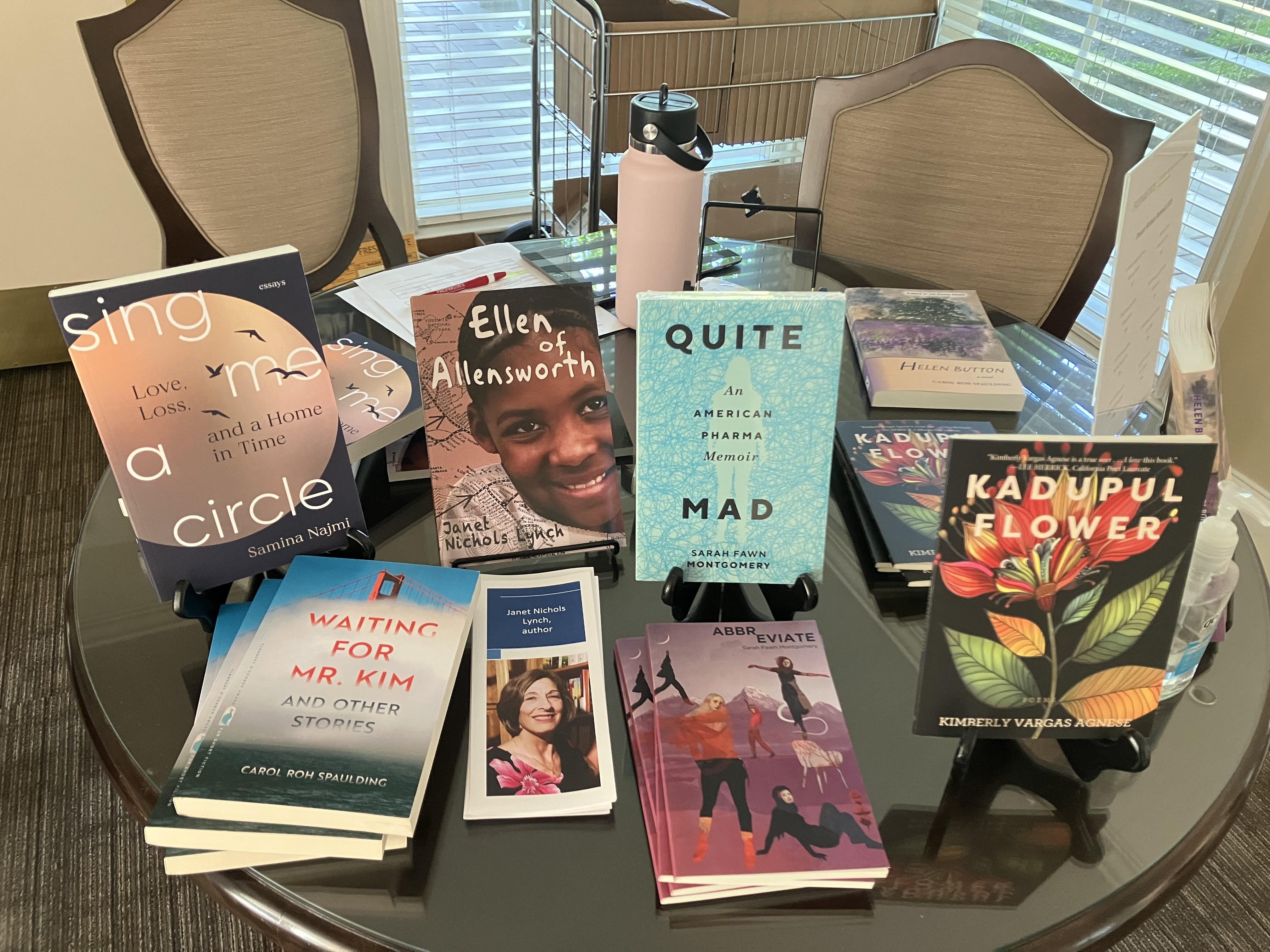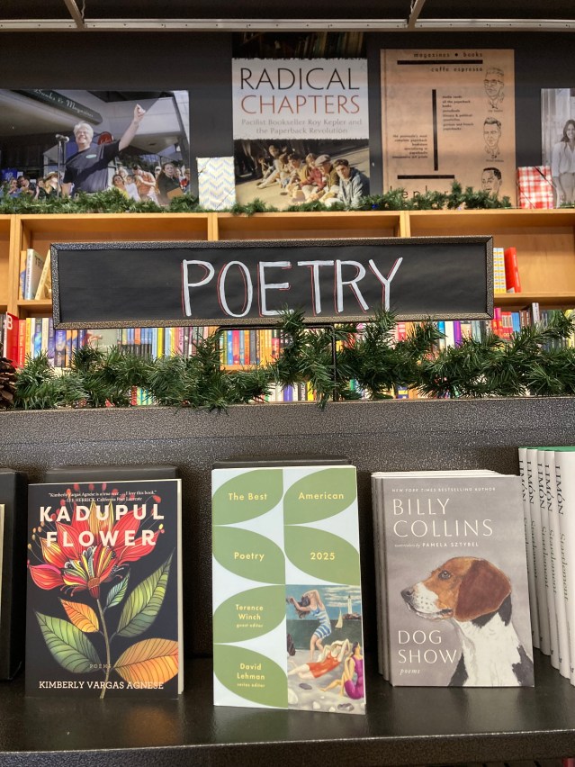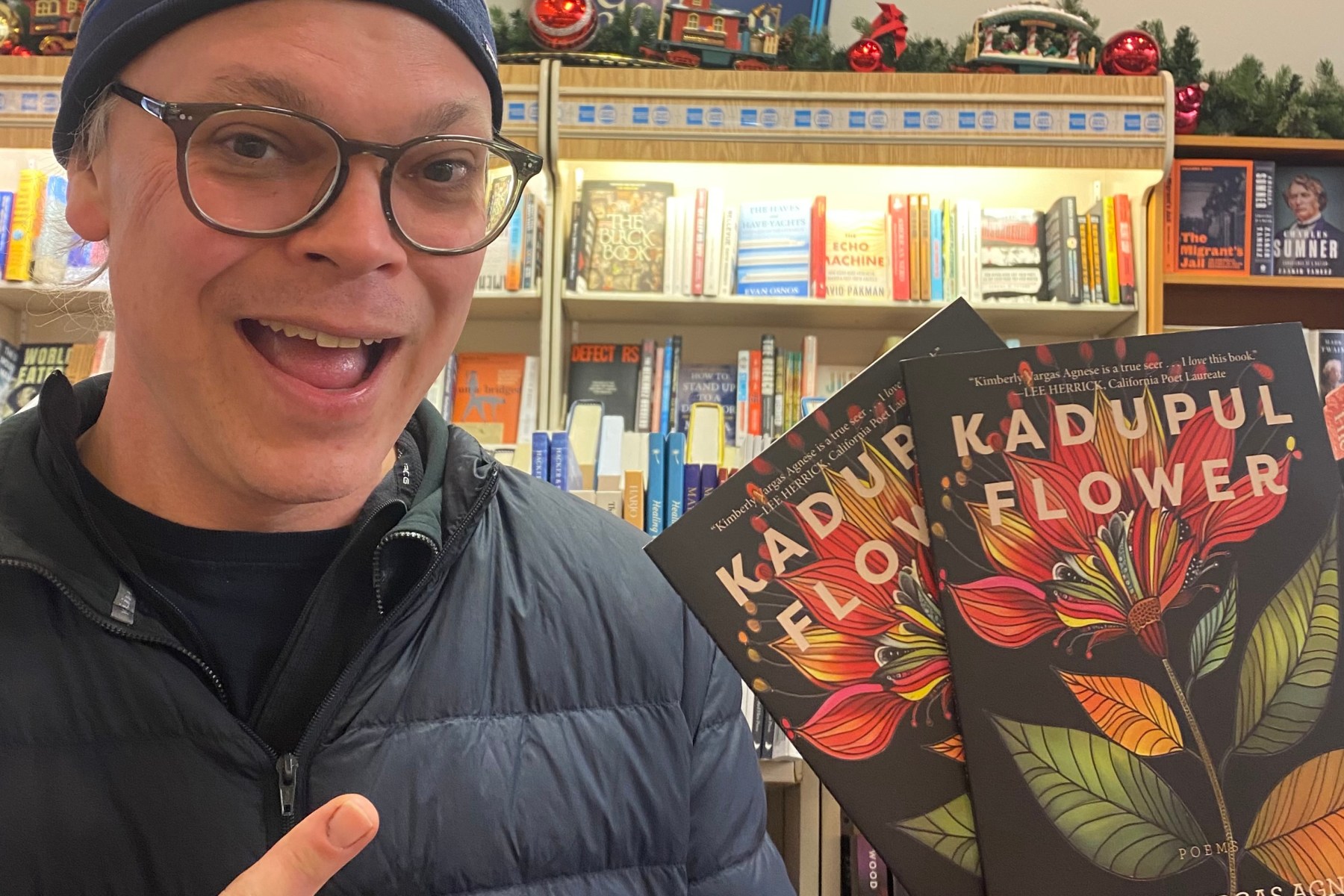 Amazing to see Kadupul Flower on the shelf with Billy Collins at Kepler’s Books!This delightful photo is from the Winchester Book Gallery in Virginia, during the community’s annual Christmas market. Mary, a librarian at the Clovis Regional Library, poses with Kadupul Flower after the November 15th reading. Shelf Life Books, the largest independent bookstore in Richmond, VA, offers Kadupul Flower in-store. For Vermont locals, Phoenix Books sells Kadupul Flower in-store.Vromans Bookstore of Pasadena is a prestigious landmark… and home to this copy of Kadupul Flower. Jefferson, facilitator of the Fresno Writers Summit, with Kadupul Flower. Kadupul Flower at the table-top bookstore of the Fresno Writers Summit, September 27th.